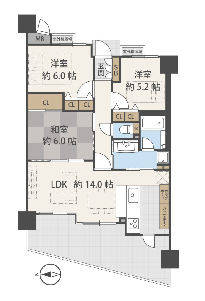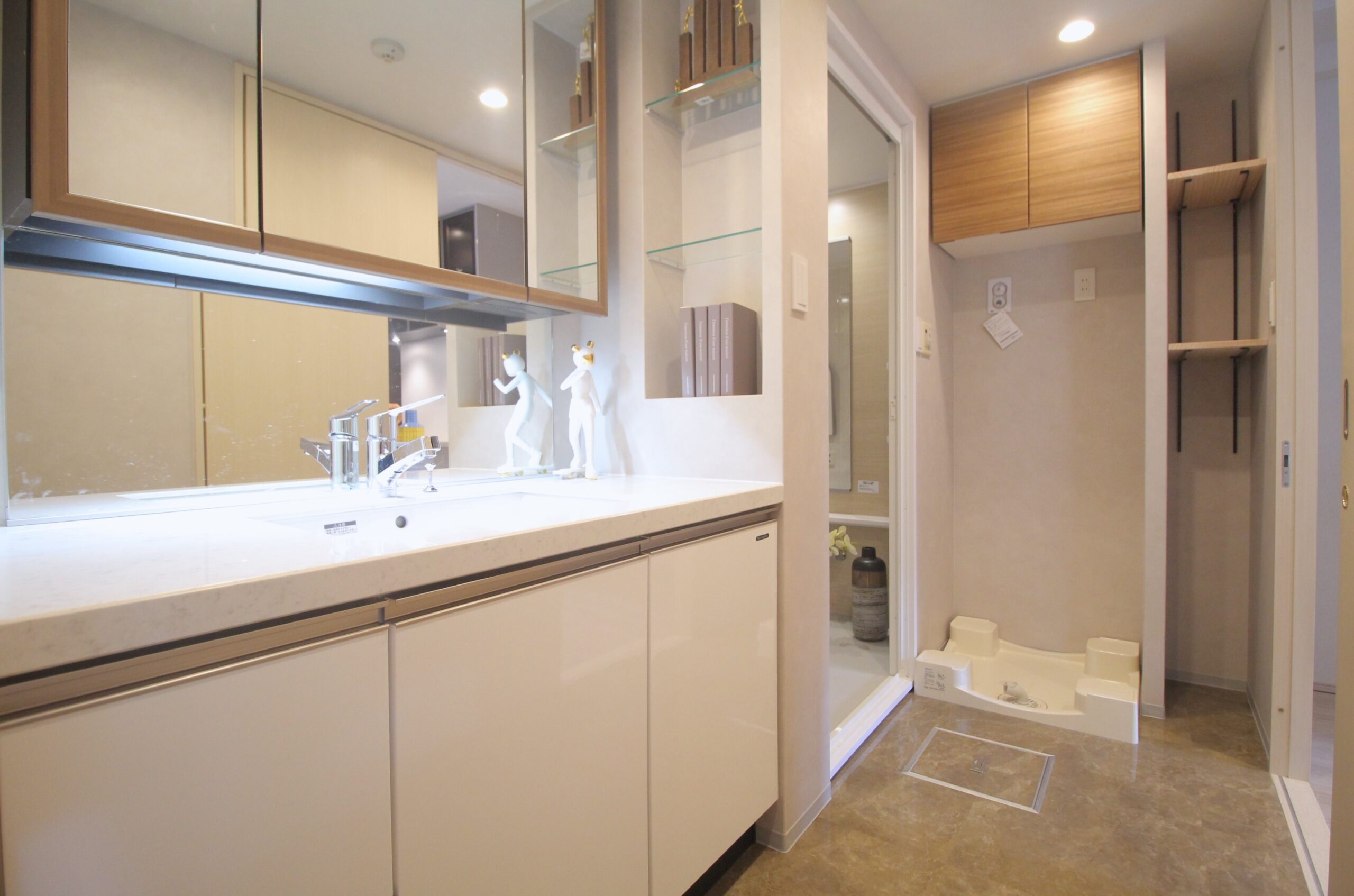 室内はグレージュで統一した中にも、ブラックや石目調の壁紙やフロアタイルで引き締められたシックモダンなインテリアとなっています。