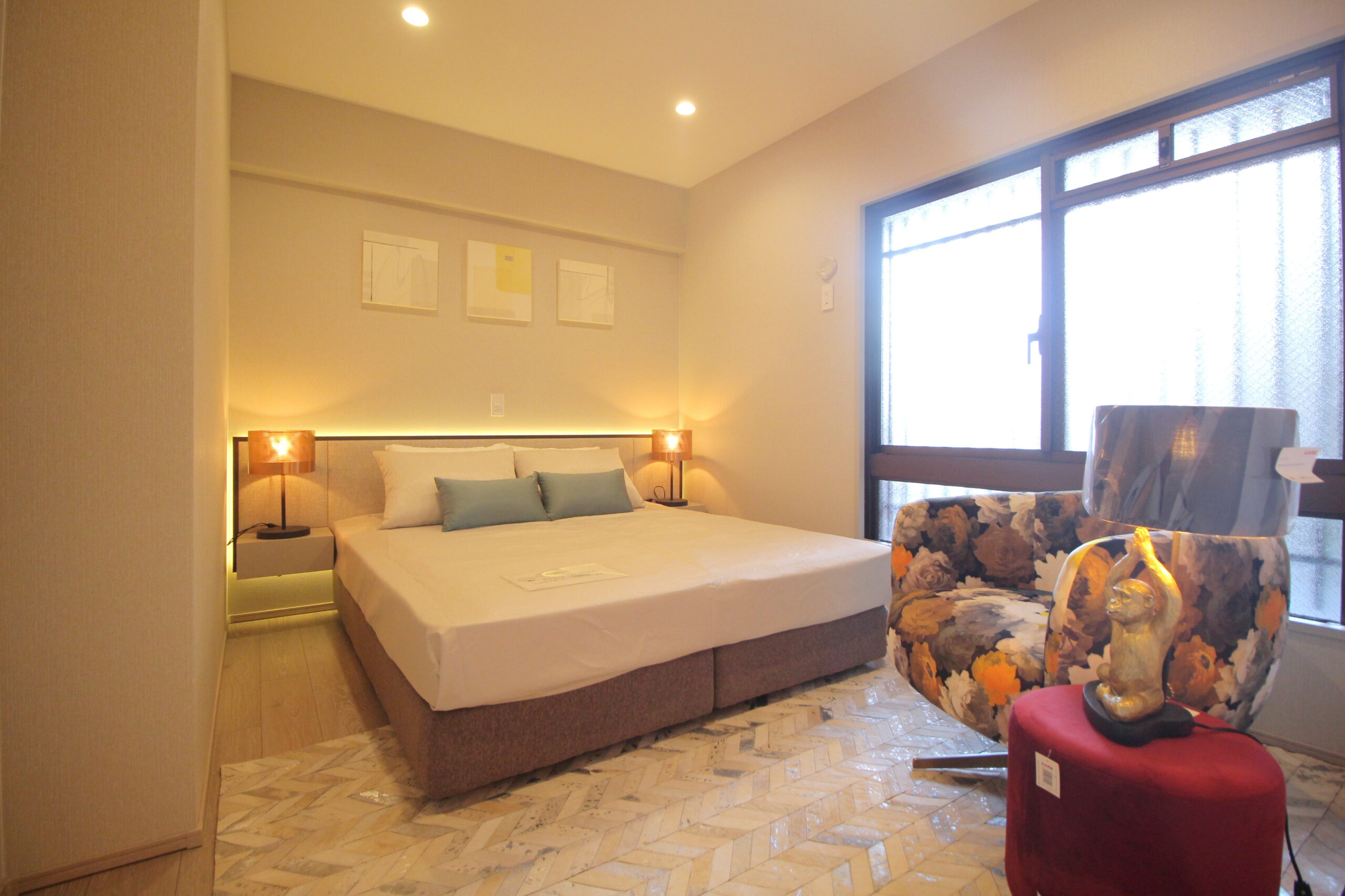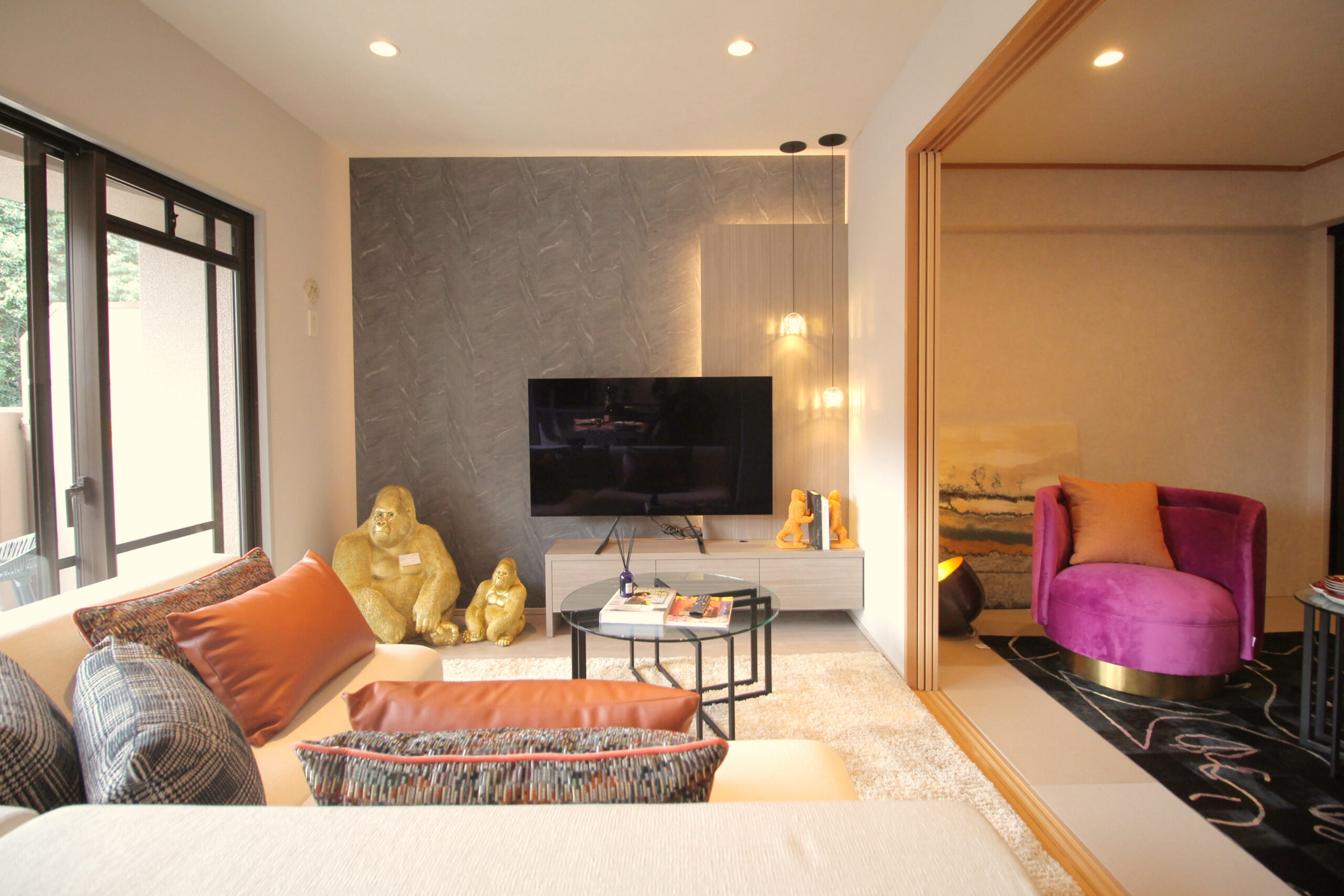 また、テレビボードやベッドボードなど様々な場所に間接照明が仕込まれており、優しく生活に彩を添えています。